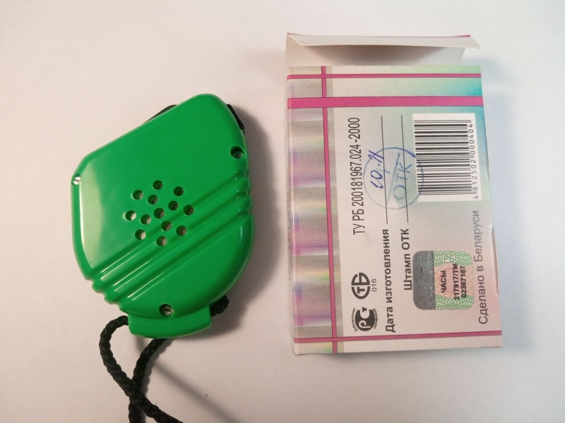 Электронные часы-секундомер производства завода "Камертон" г.Пинск. Часы имеют 2 режима работы - часы и секундомер с возможностью фиксации промежуточных значений и записи 10 результатов в память. Прибор выполнен в компактном эргономичном корпусе. Укомплектован шнурком для подвешивания на шею.